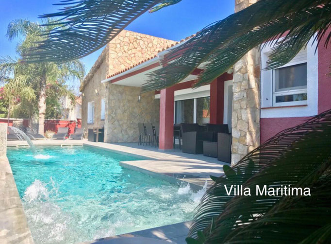 MODERN 5 BEDROOM SINGLE STOREY HOLIDAY VILLA „MARITIMA“ (150m²) FOR 10-12 SLEEPS WITH PRIVATE HEATED SWIMMING POOL, WIFI (GLASS FIBRE), SATELLITE TV , COVERED TERRACE, TABLE TENNIS AND BOCCIA GAME COURT IN THE QUIET SECTOR ALBERES OF EMPURIABRAVA